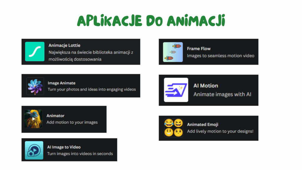 Aby łatwiej odnaleźć się w bogatej bibliotece aplikacji, Canva podzieliła je na kategorie. Dzięki temu nie musisz przeszukiwać wszystkiego w ciemno – wystarczy, że wejdziesz w odpowiednią sekcję i od razu zobaczysz narzędzia dopasowane do tego, czego potrzebujesz. Poniżej znajdziesz kilka przykładów, które pokazują, jak różnorodne są możliwości aplikacji w Canvie.