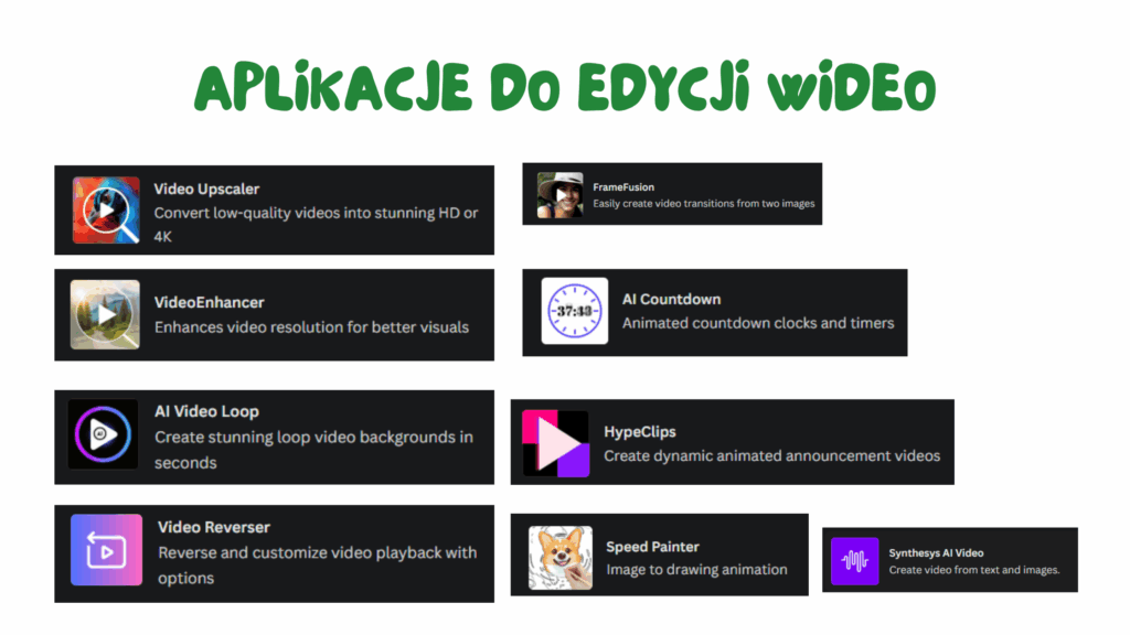 Aplikacje do edycji wideo dają Ci kontrolę nad jakością, tempem i klimatem nagrania. Video Upscaler i VideoEnhancer sprawią, że nawet przeciętne nagrania nabiorą kinowej jakości w HD lub 4K. AI Video Loop pozwoli stworzyć płynne, hipnotyzujące pętle, a FrameFusion doda eleganckie przejścia między scenami. Jeśli lubisz eksperymentować, Video Reverser odtworzy film od tyłu, a Speed Painter zamieni obraz w efekt rysunku na żywo. Do tego możesz dorzucić dynamiczne odliczania (AI Countdown) lub krótkie, animowane zapowiedzi (HypeClips). A jeśli chcesz iść w pełną automatyzację – Synthesys AI Video stworzy wideo z tekstu i obrazów w kilka chwil.