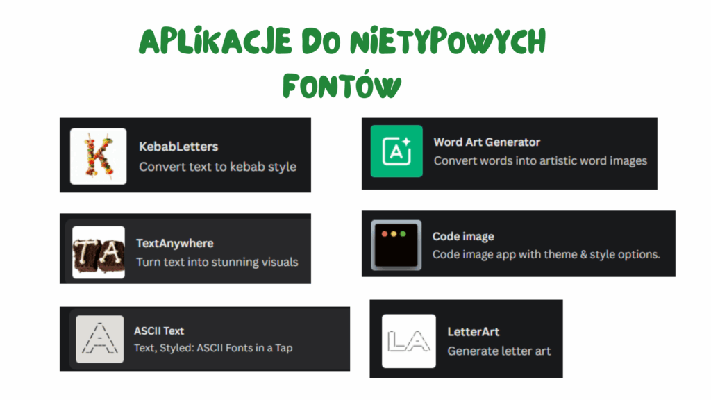 Chcesz, żeby Twój tekst wyglądał jak ułożony z warzyw, cegieł czy… kodu komputerowego? W tej kategorii znajdziesz takie perełki jak KebabLetters, Word Art Generator czy TextAnywhere, które zamieniają zwykłe litery w artystyczne obrazy. Jeśli potrzebujesz efektu kodu programistycznego, sprawdzi się Code Image, a jeśli lubisz minimalizm – ASCII Text czy LetterArt stworzą stylizowane napisy w formie prostych symboli.