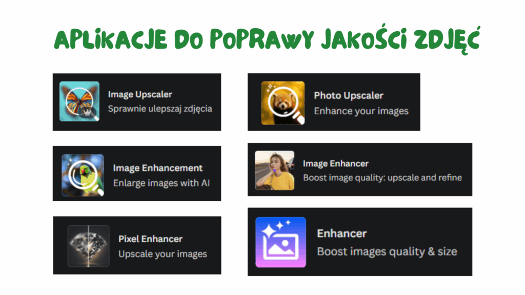 Jeśli pracujesz z obrazami o niskiej rozdzielczości lub chcesz, aby Twoje grafiki wyglądały ostrzej i bardziej profesjonalnie, sięgnij po aplikacje takie jak Image Upscaler, Photo Upscaler, Pixel Enhancer czy Image Enhancement. Dzięki technologii AI potrafią one zwiększyć rozdzielczość, poprawić ostrość i kolory, a nawet odtworzyć brakujące detale. To świetne rozwiązanie, gdy masz tylko małe zdjęcie produktu lub stare zdjęcie do odświeżenia.