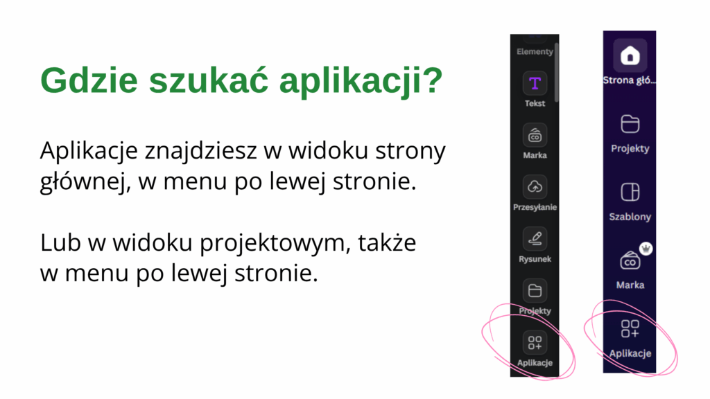 Jeśli jesteś na stronie głównej, spójrz na menu po lewej stronie – tam, obok takich zakładek jak Projekty czy Szablony, znajduje się ikona Aplikacje. Wystarczy w nią kliknąć, aby otworzyć bibliotekę dostępnych rozszerzeń.