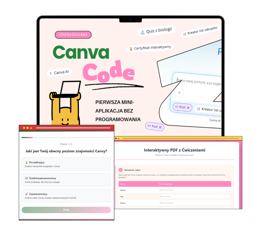 Przestań wysyłać PDF-y, które lądują w koszu. Zacznij tworzyć aplikacje, które sprzedają. Canva Code otworzy przed Tobą nowy poziom kreatywności i profesjonalizmu — bez programowania, bez stresu, z efektem „wow”.
