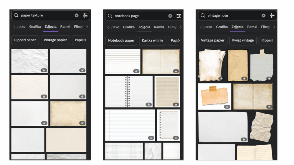 Szukasz czegoś bardziej unikatowego i niezbyt „stockowego”? Artyści często sprzedają gotowe zestawy scrapbookowych elementów: naklejki, papiery, efekty vintage, moodboardowe tekstury. Można je potem wgrać do Canvy jako własne zasoby.