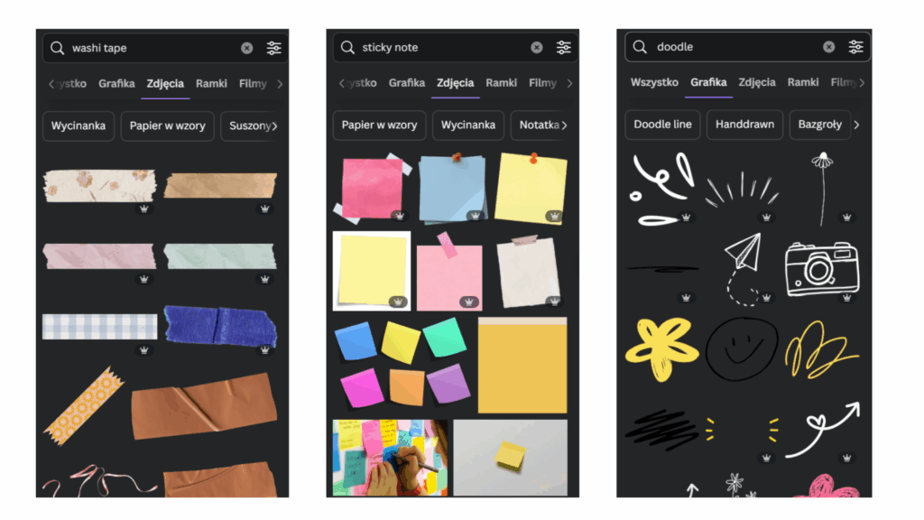 To nie tylko ozdoby – to emocje, klimat i storytelling. Szukaj elementów, które wyglądają jak wycięte, przyklejone, dorysowane „od ręki”. W Canvie znajdziesz ich sporo – tylko trzeba wiedzieć, co wpisać: