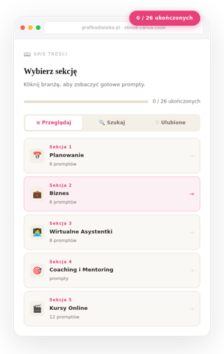 Otwierasz ebook, szukasz swojej sekcji (jest ich 26), klikasz prompt który pasuje do Twojego projektu. Możesz go też zapisać do Ulubionych na później.