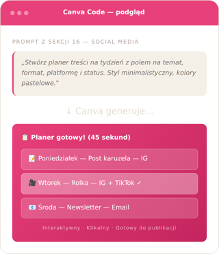 Nie musisz znać HTML-a, CSS-a ani JavaScriptu. Wpisujesz prompt — Canva buduje działający projekt. To jak rozmowa z inteligentnym asystentem, który zamienia Twój pomysł w żywe narzędzie.