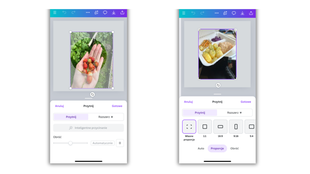 Kadrowanie pozwala na dokładne dopasowanie elementów w projekcie, co jest kluczowe dla estetycznego wyglądu. Jeśli potrzebujesz wykadrować zdjęcie to wystarczy, że klikniesz na nie dwa razy i przeciągniesz kółka, które pojawią się w rogach zdjęcia. Możesz także zmienić kształt zdjęcia. Tutaj pomocne są ramki (znajdziesz je w zakładce elementy), które pomogą nadać zdjęciu dowolny kształt.