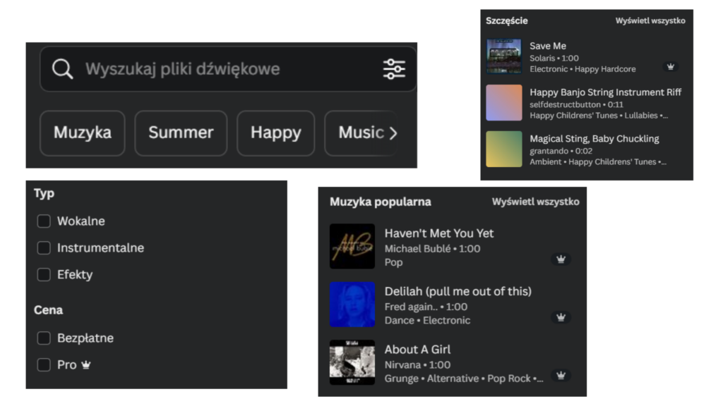 👉Gatunki i nastroje: Canva pozwala filtrować muzykę według gatunków, takich jak pop, rock, elektronika, klasyka i wiele innych. Możesz również wyszukiwać utwory na podstawie nastroju, np. szczęśliwy, smutny, energiczny, spokojny.