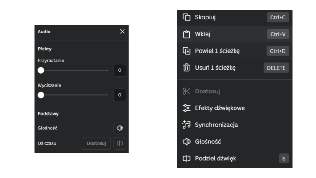 Canva pozwala na regulację głośności każdego utworu audio na osi czasu. Wystarczy: