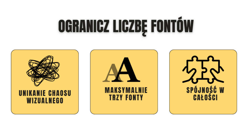 Ogólna zasada mówi o ograniczeniu liczby fontów do trzech. Dlaczego trzy? Pierwszy font może być użyty dla nagłówków, drugi dla głównego tekstu, a trzeci dla akcentów lub wyróżnień (np. cytaty, przypisy). Ta zasada pozwala na wystarczającą różnorodność, jednocześnie zachowując porządek i klarowność projektu.