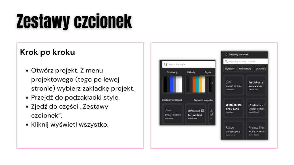 Canva oferuje również funkcję ‘Font Combinations, czyli zestawy czcionek’, która jest szczególnie przydatna dla tych, którzy dopiero zaczynają swoją przygodę z projektowaniem.