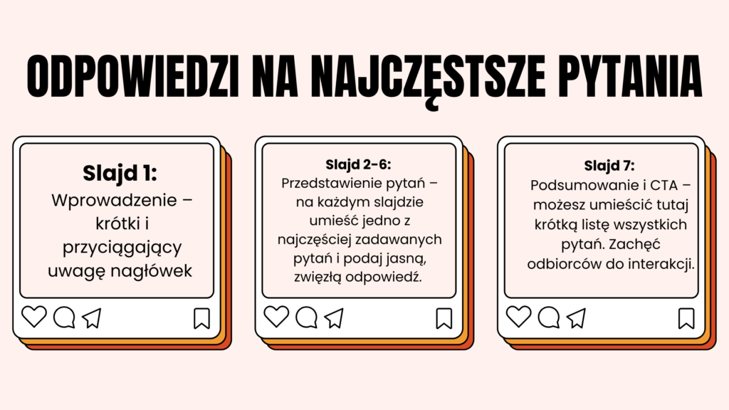 - Slajd 1: Wprowadzenie – krótki i przyciągający uwagę nagłówek, np. “Najczęstsze pytania, które zadają mi klienci” lub “Masz te same pytania?”. To wprowadzenie zachęci odbiorców do przesuwania kolejnych slajdów.