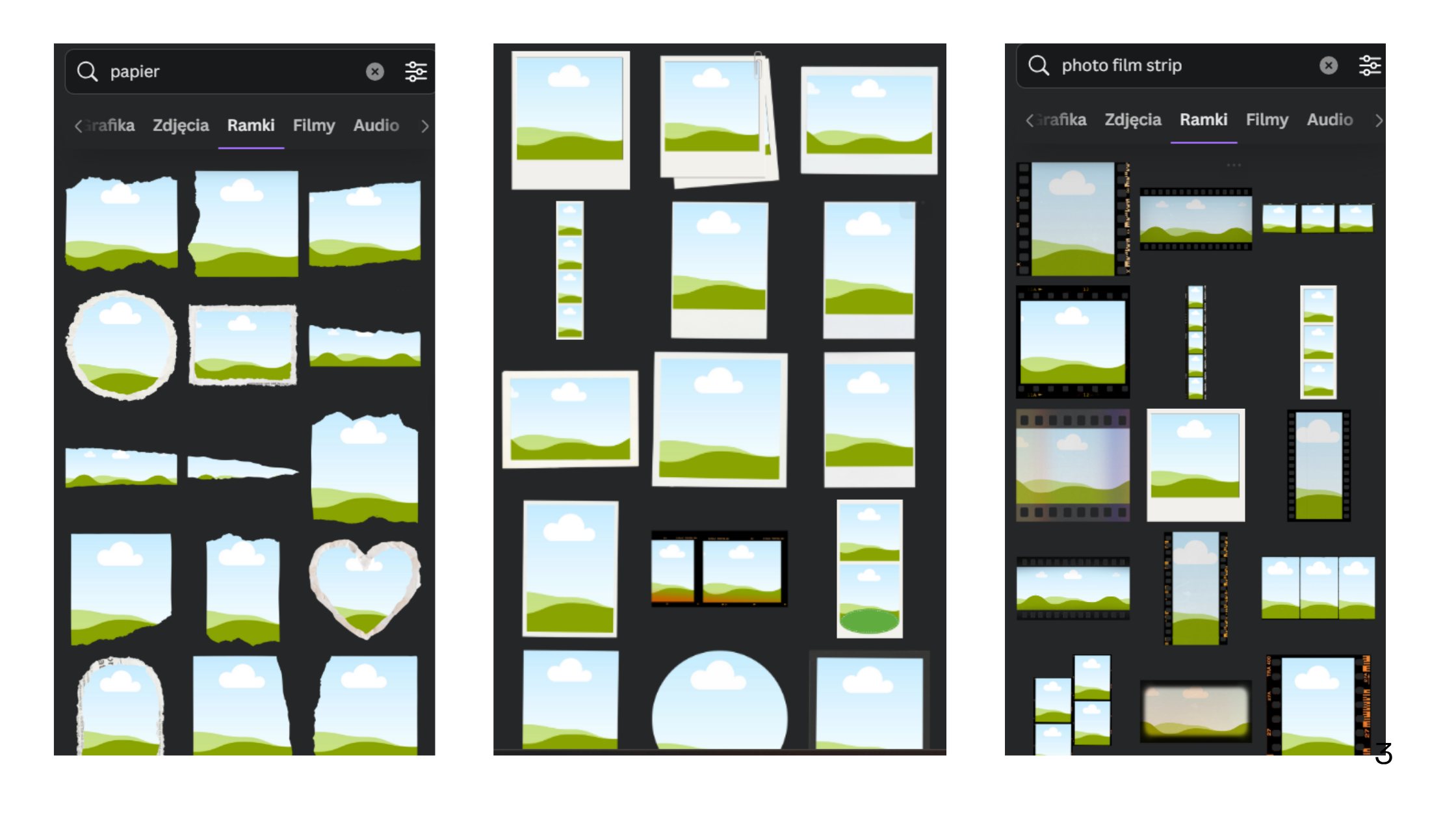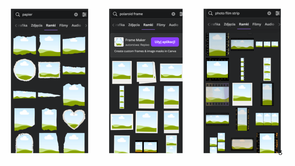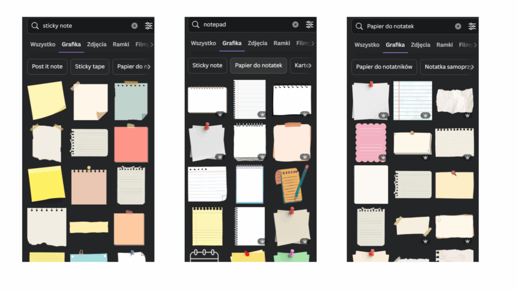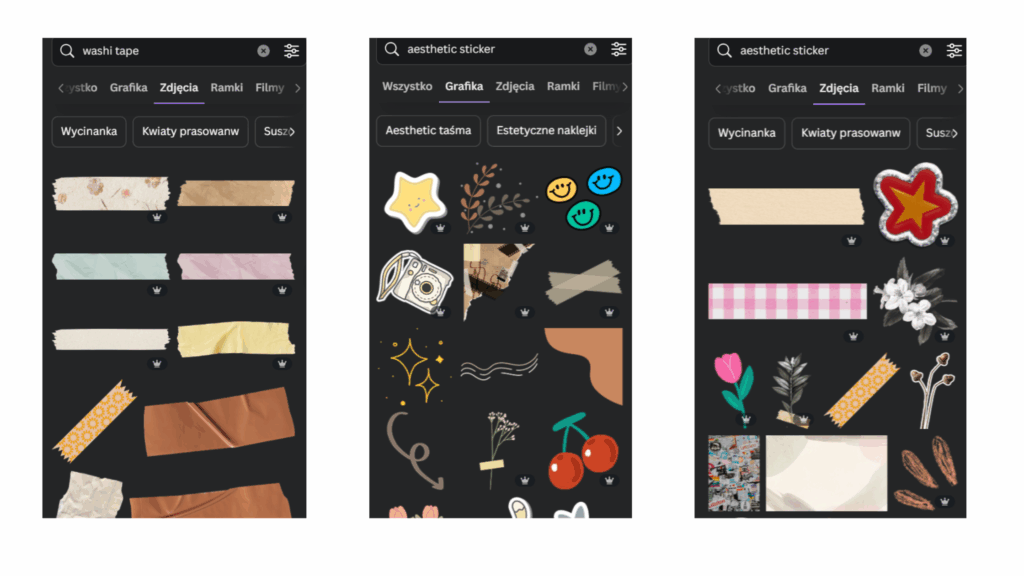 Wszystko to znajdziesz w Canvie – wystarczy wpisać w wyszukiwarkę elementów takie frazy jak: