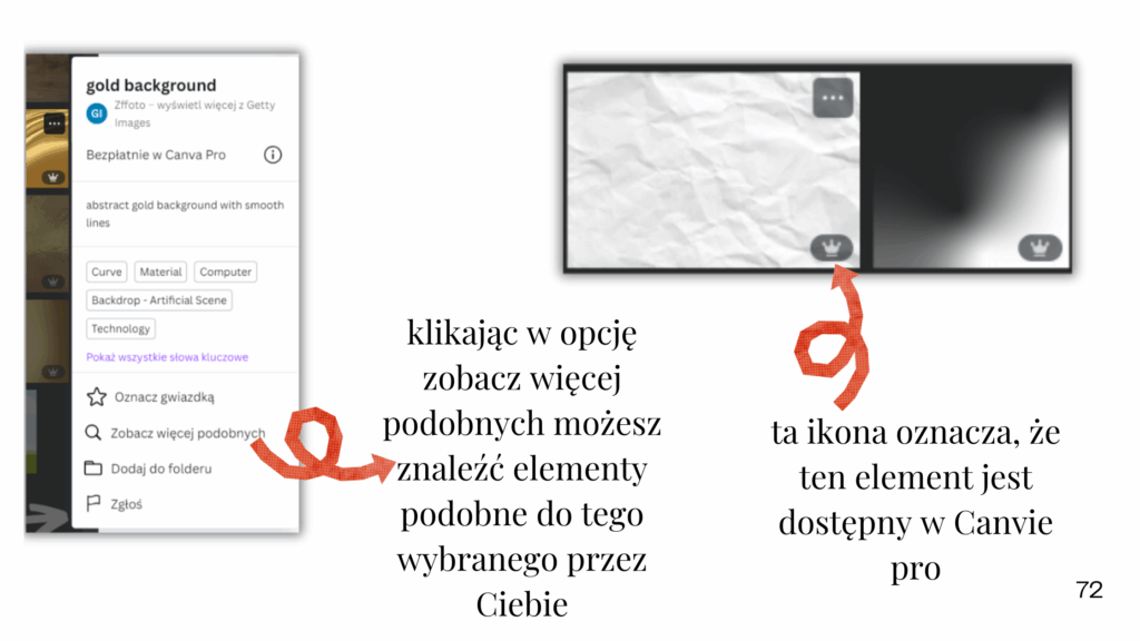 I jeśli masz Canvę w wersji Pro – to mniejszy problem, bo dostęp do całej biblioteki otwiera Ci drzwi do naprawdę ogromnych zasobów. Ale jeśli pracujesz na Canvie bezpłatnej, pewnie chcesz uniknąć sytuacji, w której klikasz w piękny element… a tam wyskakuje korona i komunikat, że jednak tego nie użyjesz.