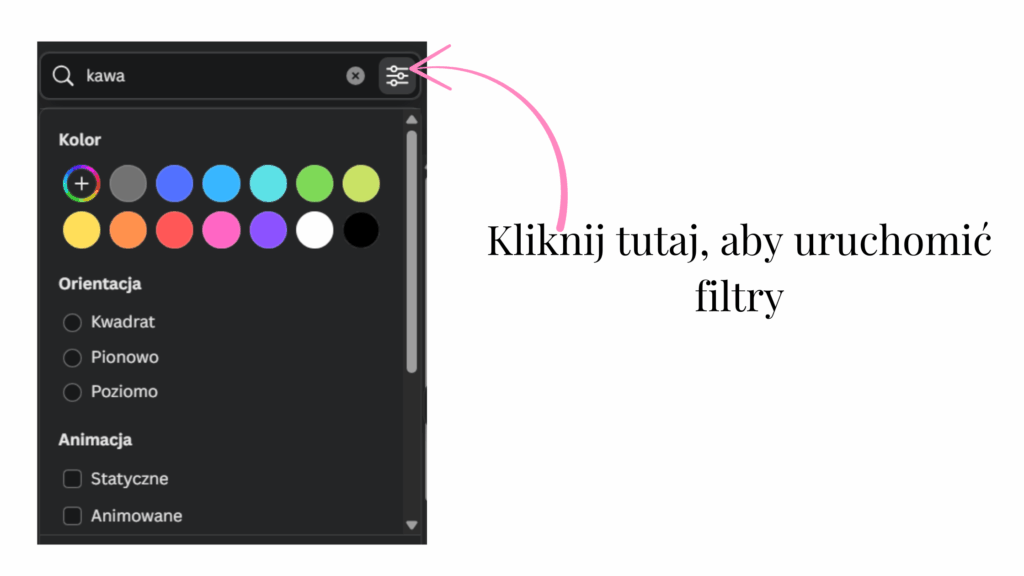 Po wpisaniu słowa kluczowego w pasek wyszukiwarki w zakładce elementy pojawi się ikona suwaków. Kliknij ją, a otworzy się dodatkowe menu z opcjami filtrowania. Możesz wybrać na przykład konkretny kolor – jeśli tworzysz grafikę w różu i czerni, od razu odfiltrowujesz wszystkie niepasujące elementy.