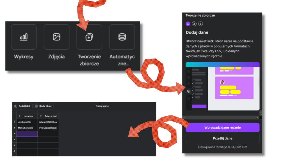 - Zaimportowanie pliku do Canvy – w aplikacji Tworzenie zbiorcze importujesz plik CSV do swojego projektu, co pozwala na automatyczne wprowadzenie danych do odpowiednich pól w szablonie.