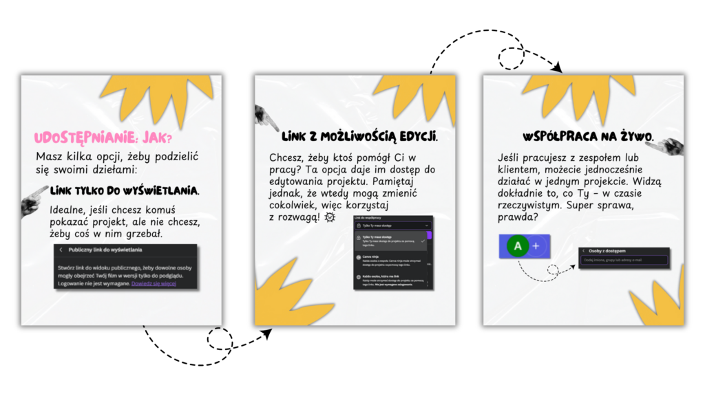 Jednak gdy zdecydujesz się udostępnić swój projekt, Canva daje Ci różne opcje: