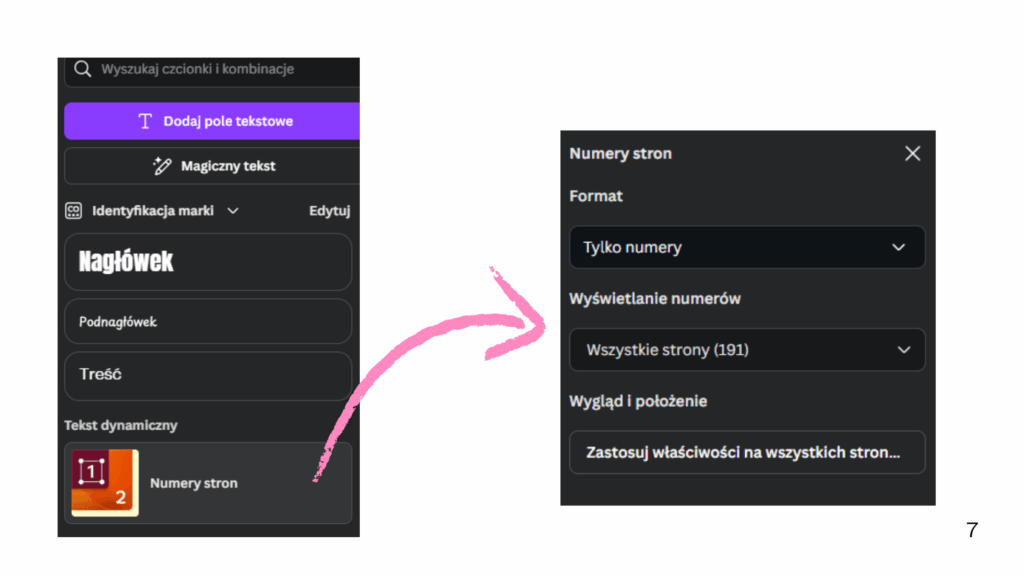 ✅ Numeracja stron – Canva ma teraz automatyczne narzędzie do numerów stron, dzięki któremu nie musisz wstawiać ich ręcznie. Wystarczy wejść w: TEKST -> numery stron, a następnie wybrać: