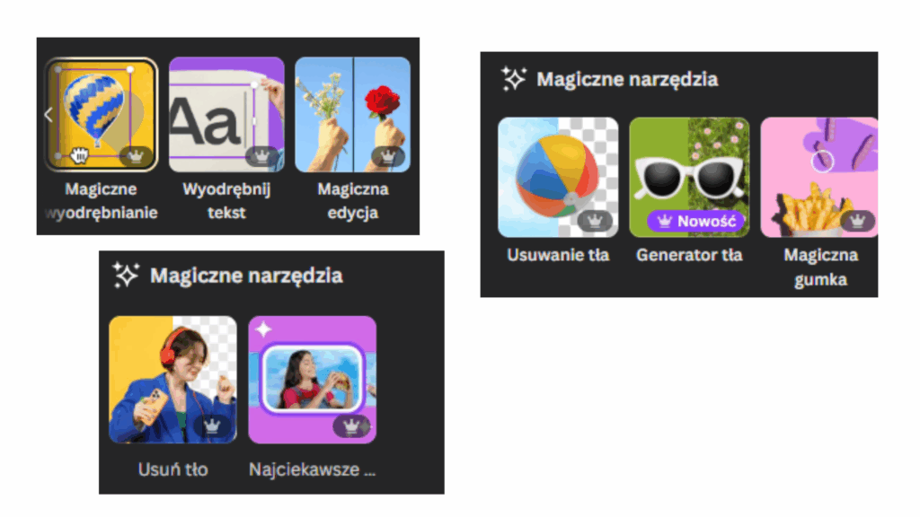 – Magiczne wyodrębnianie – zaznaczasz tylko to, co chcesz zostawić (np. danie lub postać), a Canva sama usuwa resztę,