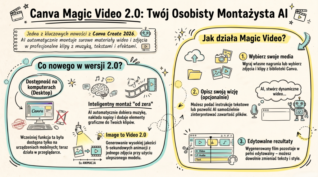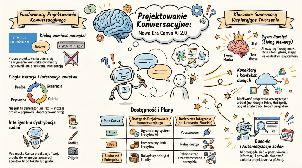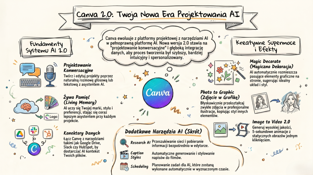 Canva 2.0 to faktycznie zmiana – i nie mówię tu o kolejnych przyciskach w menu. Dwie funkcje, które naprawdę warto wdrożyć od razu, to projektowanie konwersacyjne i Memory. Konektory i Magic Video 2.0 to solidne uzupełnienie. Reszta nowości? Warta obserwacji, ale bez pośpiechu.