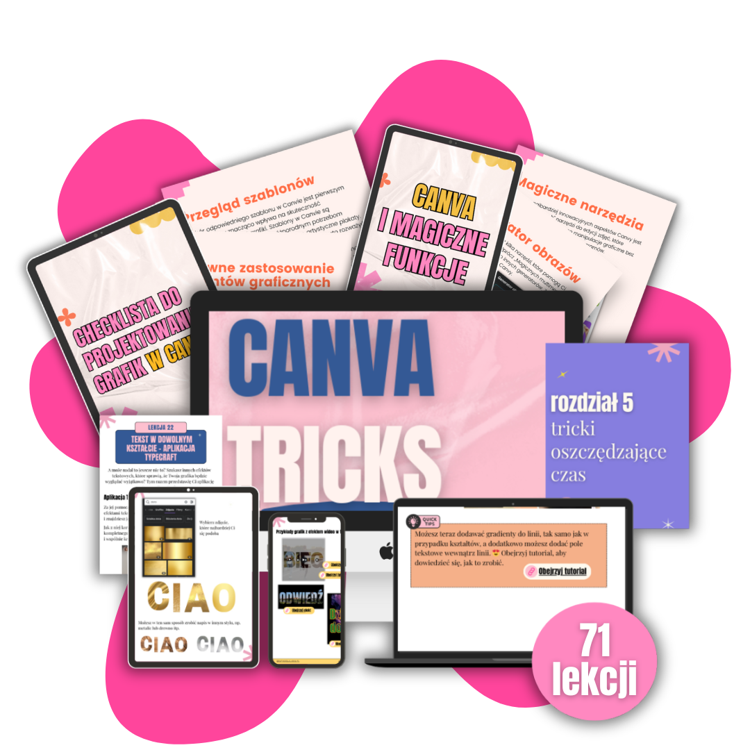 W pakiecie znajdziesz e-book “Canva Tricks”, który odkryje przed Tobą wszystkie sekrety Canvy, a także kurs “Canva dla laika”, który wprowadzą Cię w świat dynamicznego tworzenia treści na Instagramie.