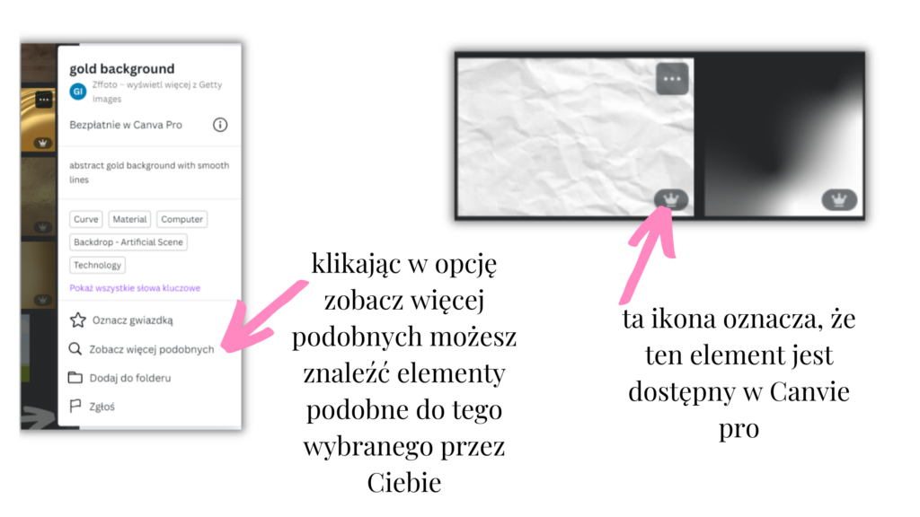 Jeśli znajdziesz grafikę, która idealnie pasuje, kliknij trzy kropki przy elemencie, a następnie wybierz Zobacz więcej podobnych. Canva pokaże Ci inne zasoby w tym samym stylu, co pomoże zachować spójność wizualną. - Szukaj według autora