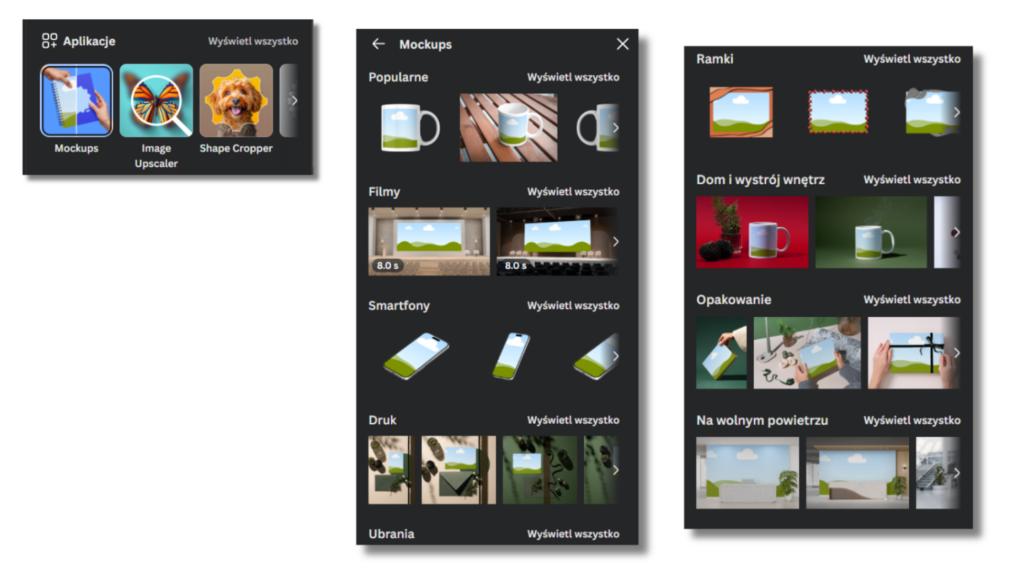 Mockupy to wizualizacje, które przedstawiają, jak Twój projekt będzie wyglądał w rzeczywistym świecie, np. na ekranie telefonu, plakatach, koszulkach, kubkach czy laptopach. Dzięki tej funkcji możesz profesjonalnie zaprezentować swoje projekty w kontekście, który najlepiej oddaje ich potencjał.