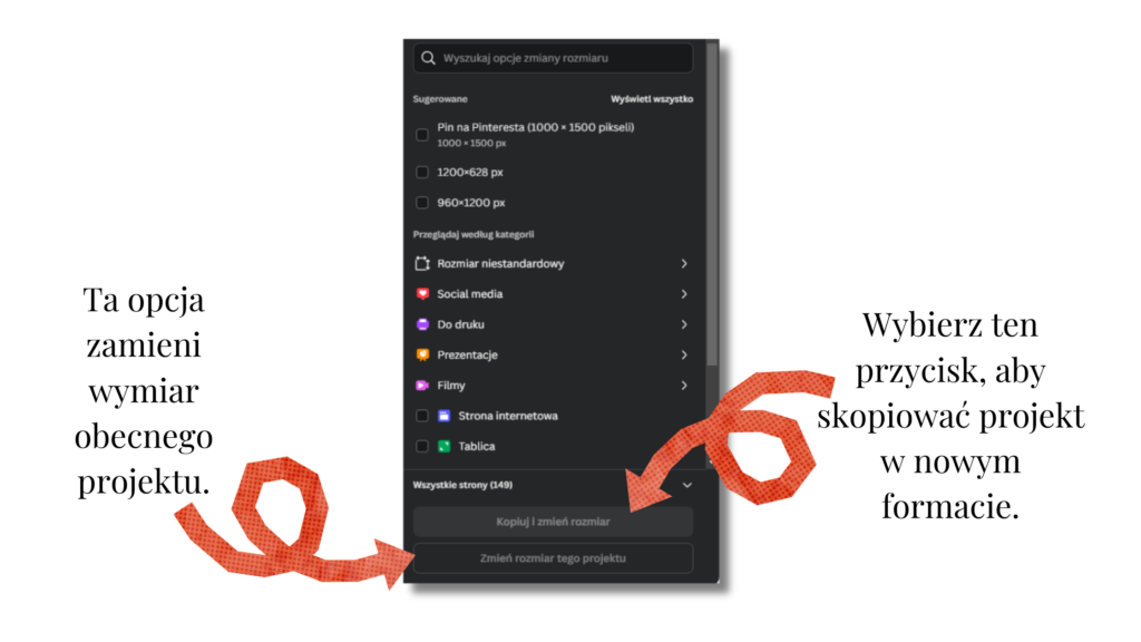 Przygotowałaś projekt postu na Instagram, ale chciałabyś go opublikować także na przykład na Pintreście? Nie martw się, nie musisz robić go od nowa. Tutaj przychodzi z pomocą funkcja automatycznej zmiany rozmiaru, które pozwala na błyskawiczne dostosowanie projektu do różnych formatów, bez konieczności rozpoczynania pracy od zera.